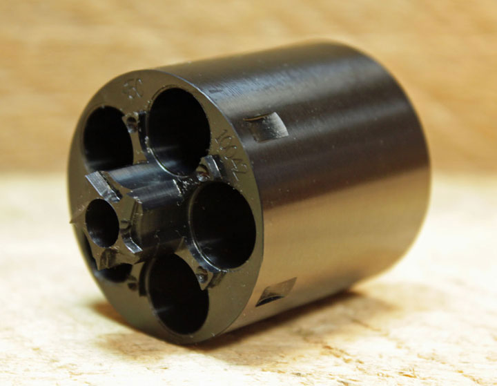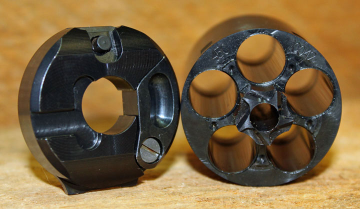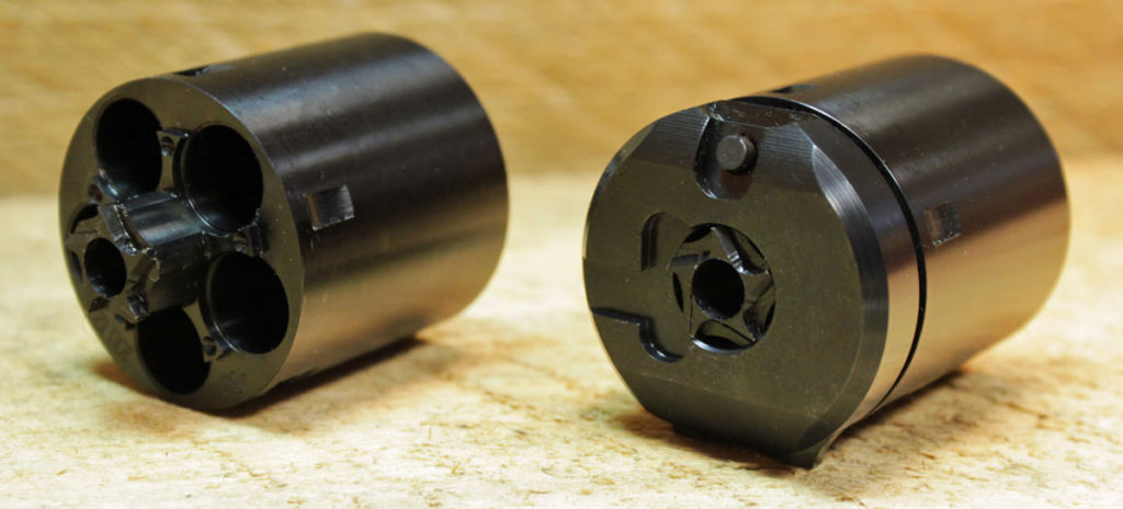 To remedy that problem Walt Kirst redesigned the 1858 Remington Konverter with 5 evenly spaced chambers and a hammer actuated firing pin retainer, located between each of the chambers. It’s called the “Equalizer” Konverter.