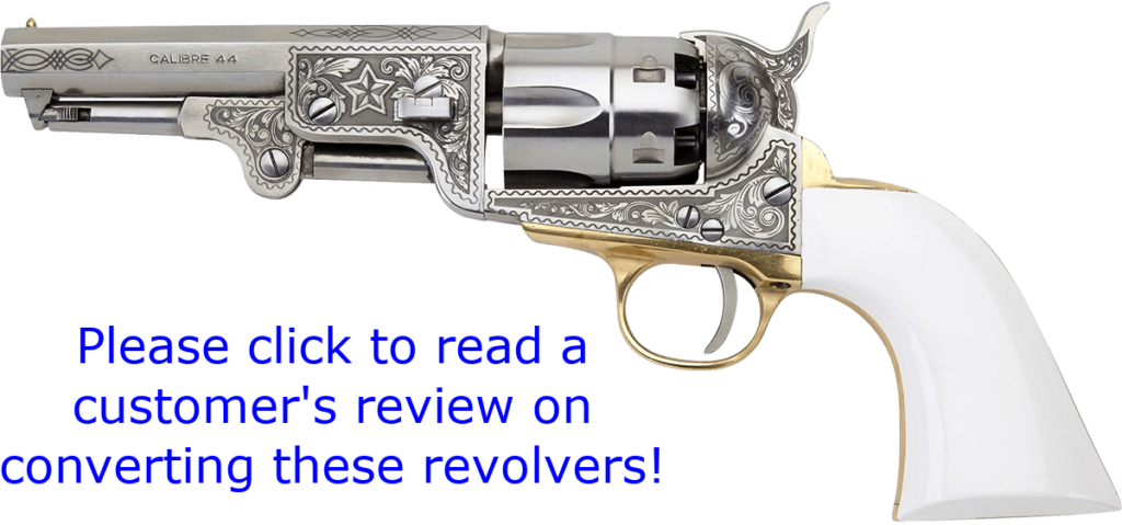 Please note that all the selected .44 caliber Pietta Navy revolvers shown here have steel frames. Never install a cartridge converter in a brass frame revolver, as they are not safe to fire cartridges in.
