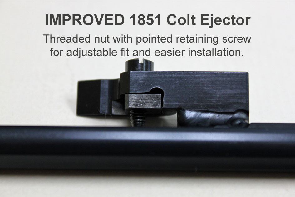 The 1851 Colt ejector assembly has been improved by adding a threaded nut, so the assembly can self-adjust as it is installed into the revolver. A pointed retaining screw has also been added to make the installation easier, as it will self-align with the adjusting nut and the threads on the loading lever housing. Each ejector assembly comes with simple, step-by-step instructions taking the guess work out of the installation process.